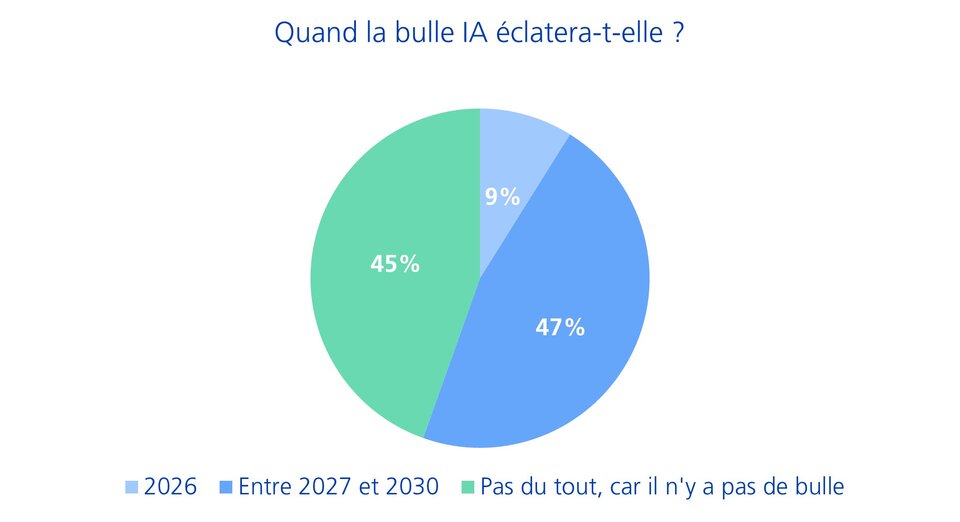Dans le cadre de cette enquête Swisscanto, les CIO interrogés ont été invités à évaluer l l'évolution actuelle du marché dans le domaine de l'intelligence artificielle (IA). Les résultats montrent une opinion partagée : 45% des répondants ne considèrent pas la situation actuelle comme une bulle spéculative. En même temps, près de la moitié des CIO prévoient un crash entre 2027 et 2030. Malgré la présence actuelle du sujet dans le débat public, seulement 9% des personnes interrogées s'attendent à un tel scénario dès 2026 (graphique 4).